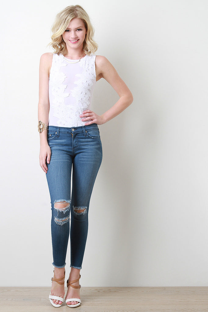 These low rise jeans features belt loops, 5-pockets, zipper fly, single button closure, stretchy taper cut legs, distress holes at knees, and fringe hemline. Accessories sold separately. Made in U.S.A. 59% Rayon, 23% Cotton, 17% Polyester, 1% Spandex.