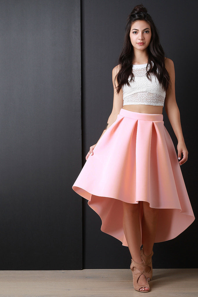 This skirt features a wide waist band, large box pleated construction, a-line cut, and a high low hemline. Accessories sold separately. Made in U.S.A. 92% Polyester, 8% Spandex.