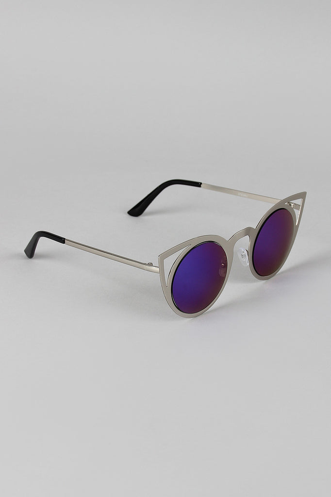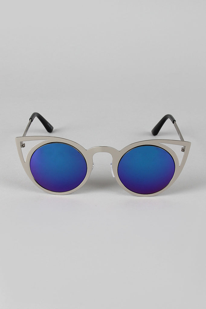 These sunglasses feature a cat eye shape matte metallic frame, cutout corners design, and colorful round reflective lenses.