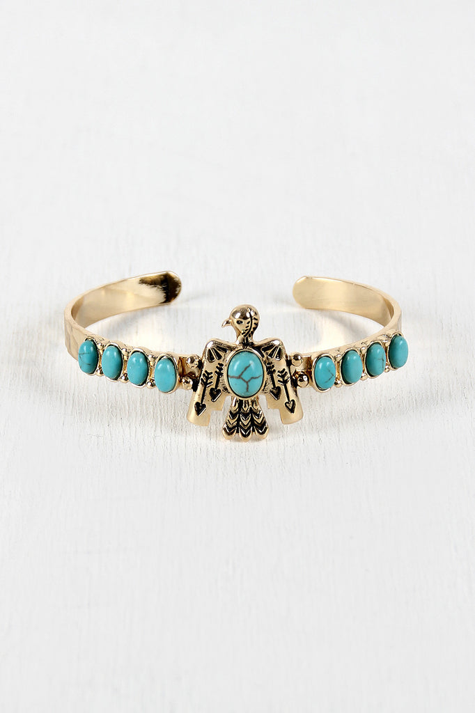 An open-ended bracelet featuring a hammered metallic band, a rising eagle motif at the front, and oval faux turquoise stones. Nickel, lead, and cadmium compliant.