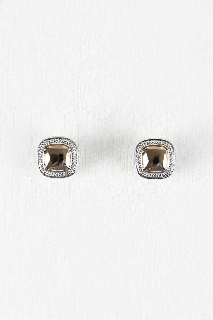 Vintage-inspired earrings that feature a textured square frame, rounded corners, and contrast color glossy center. Finished with a clip post back.