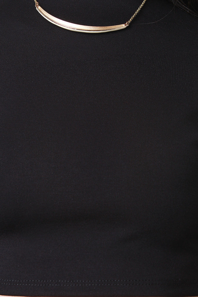 This top features a mock neckline, long sleeves and jersey knit fabrication. Finished with a back zipper and a crop hemline. Accessories sold separately. Made in U.S.A. 67% Rayon, 28% Nylon, 5% Spandex.