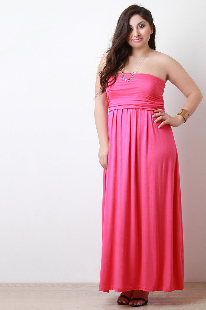 This dress features a jersey knit fabrication, curve hugging fit, strapless and ruched elasctized tube neckline. Finished with a cinched waist. Accessories sold separately. Made in U.S.A. 95% Rayon, 5% Spandex.