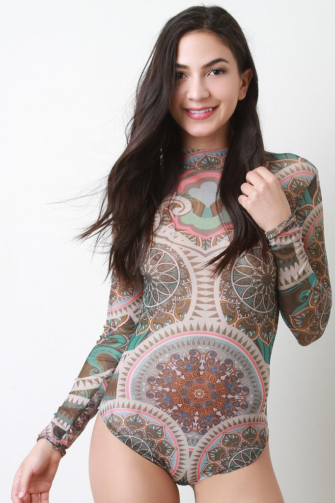 Semi-Sheer Sublime Mesh Tribal Print Bodysuit