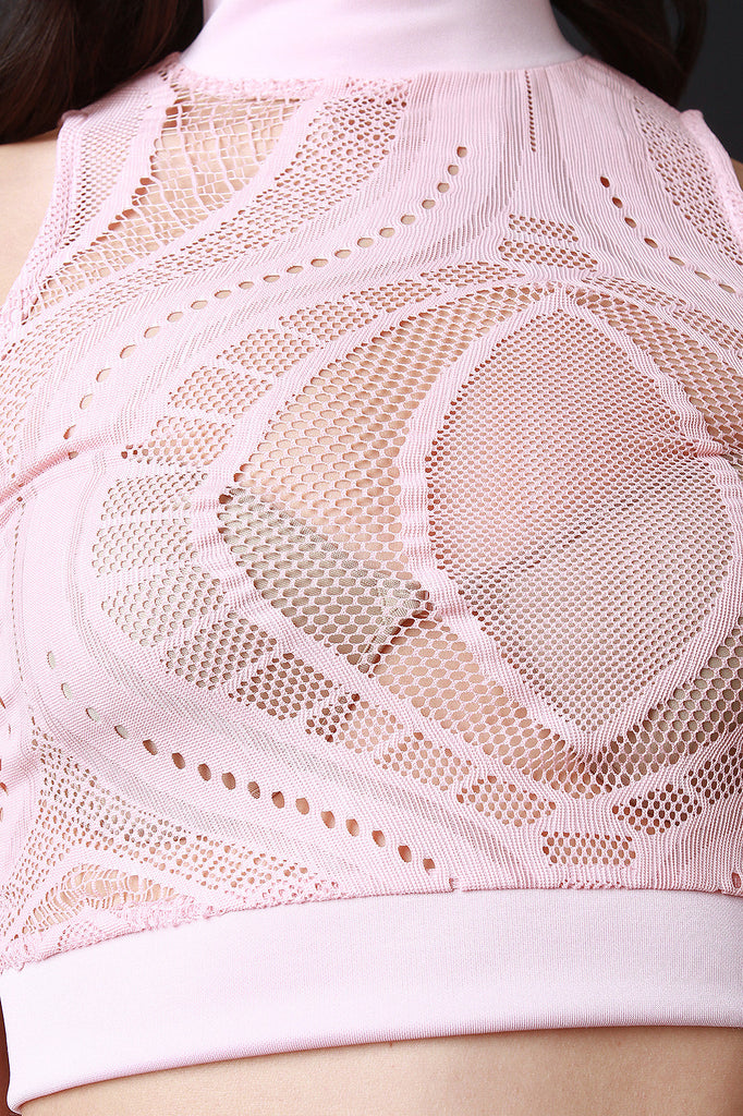 This top features an oval mesh lace pattern fabrication, mock neckline, sleeveless construction, and wide panel cropped hemline. Finished with a rear zip-up closure. Accessories sold separately. Made in U.S.A. 97% Nylon, 3% Spandex.