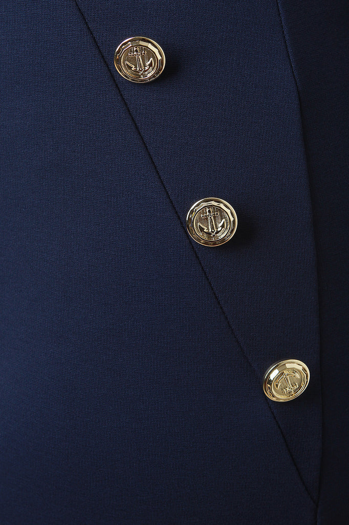 This skirt features a stretchy knit fabrication, elasticized waistband, gold anchor detailed buttons accent, and pencil cut fit. Finished with an asymmetrical hemline, and back slit. Accessories sold separately. Made in U.S.A. 66% Rayon, 30% Nylon, 4% Spandex.