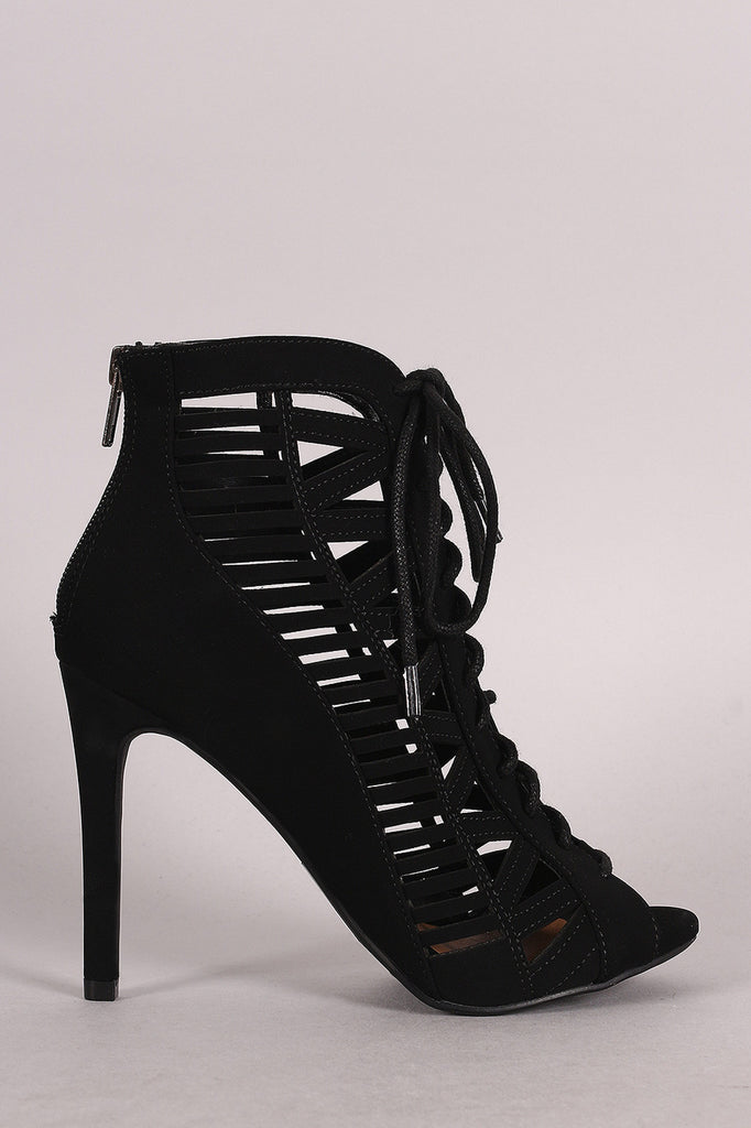 These fashionable booties feature a peep toe silhouette, caged cutout design vamp with lacing detail, and wrapped stiletto heel. Finished with lightly padded insole and rear zipper closure for easy on/off.