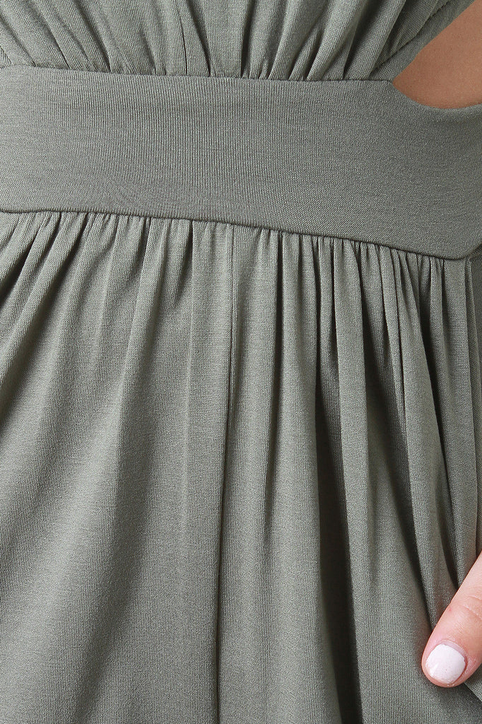 This jumpsuit features soft jersey knit, plunge neck with v-shape boning, ruched detail, open sides, and criss-cross strappy back. Accessories sold separately. Made in U.S.A. 95% Rayon Modal, 5% Spandex.