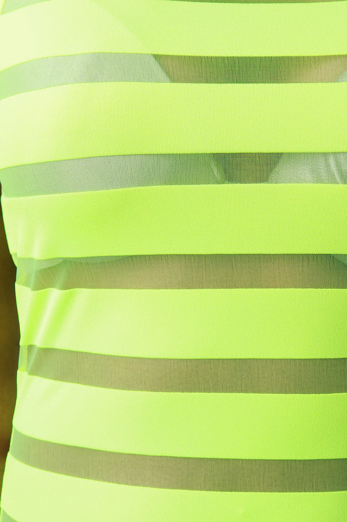 This sexy dress features a semi sheer striped top, sleeveless design, low cut back, rounded neckline, slim fit solid skirt with a thigh high slit. Accessories sold separately. Made in U.S.A. 90% Polyester 10% Spandex.