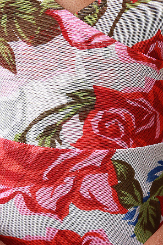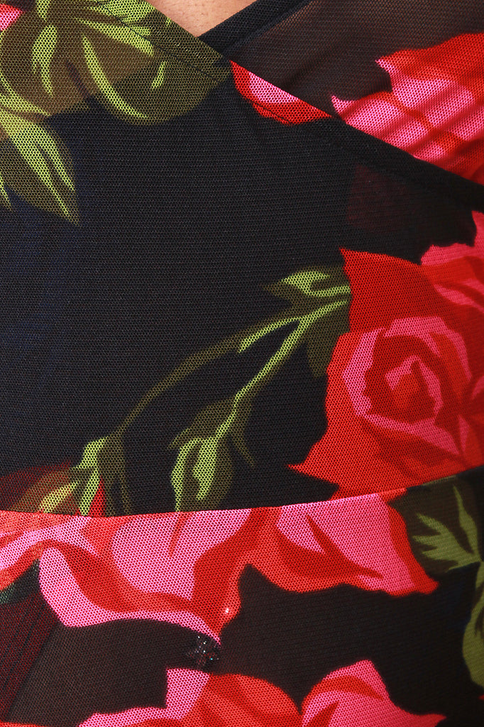 This beautiful maxi dress features a semi-sheer mesh fabrication with roses print pattern, deep v-neckline in faux wrap design, and quarter sleeves fit. Finished with a high slit detail. Accessories sold separately. Made in U.S.A. 100% Polyester.