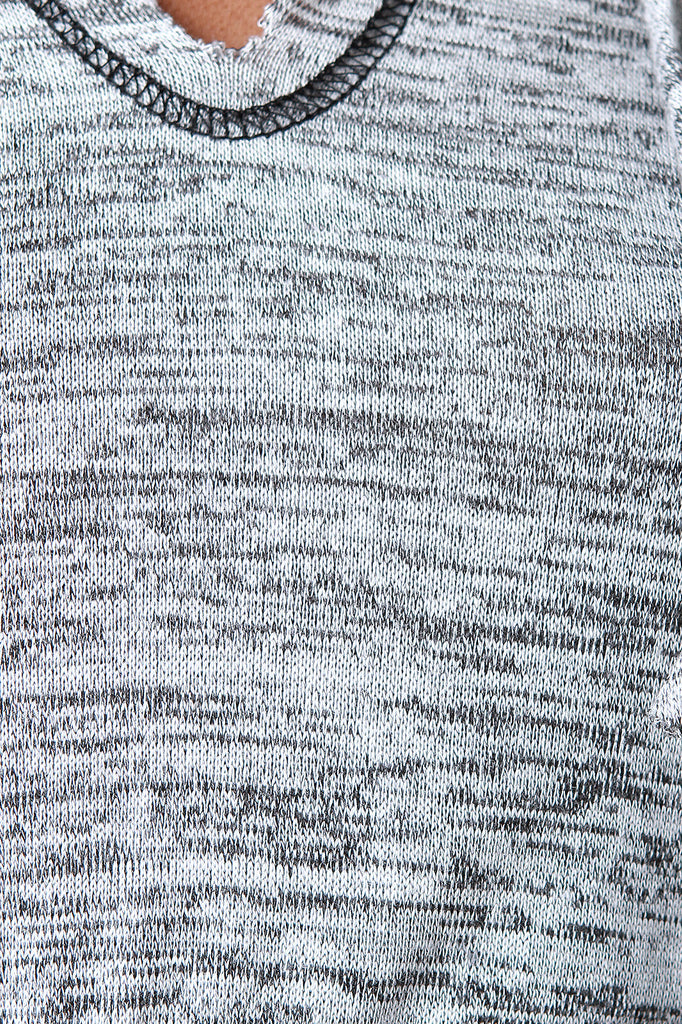 This top features a marled knit fabrication, sleeveless fit, attached back hoodie, and cropped hemline with contrasting ribbed knit detail. Accessories sold separately. Made in U.S.A. Self: 80% Rayon, 17% Polyester, 3% Spandex, Contrast: 86% Polyester, 10% Rayon, 4% Spandex.