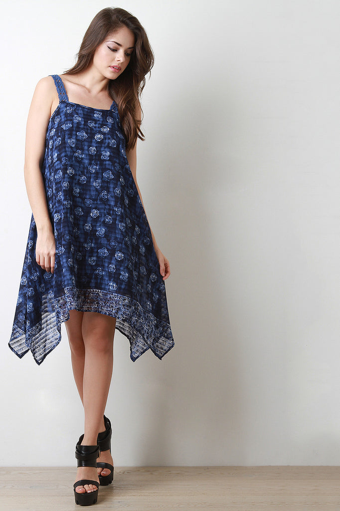 This shift dress features a square neckline, crochet lace straps, chiffon fabrication, batik style print, fully lined, finished with a handkerchief hemline. Accessories sold separately. Made in U.S.A. 100% Polyester.