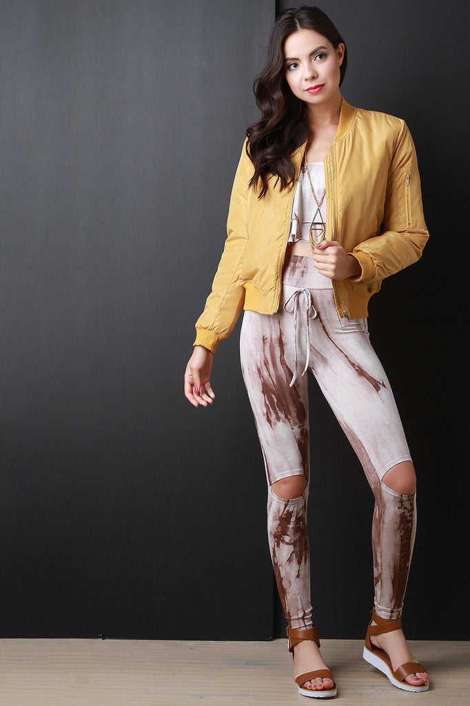 This puffy bomber jacket features windbreaker fabric, rib knit trim, zip up front, zip accent on left sleeve, and two pockets. Finished with quilted lining. Accessories sold separately. 100% Polyester.