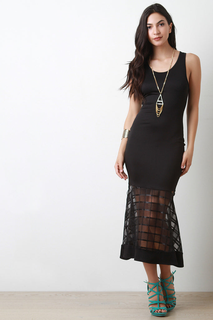 This maxi dress features smooth stretch fabric, scoop neckline, grid mesh peplum skirt, and back zipper closure. Accessories sold separately. Made in USA. 92% Polyester, 8% Spandex.