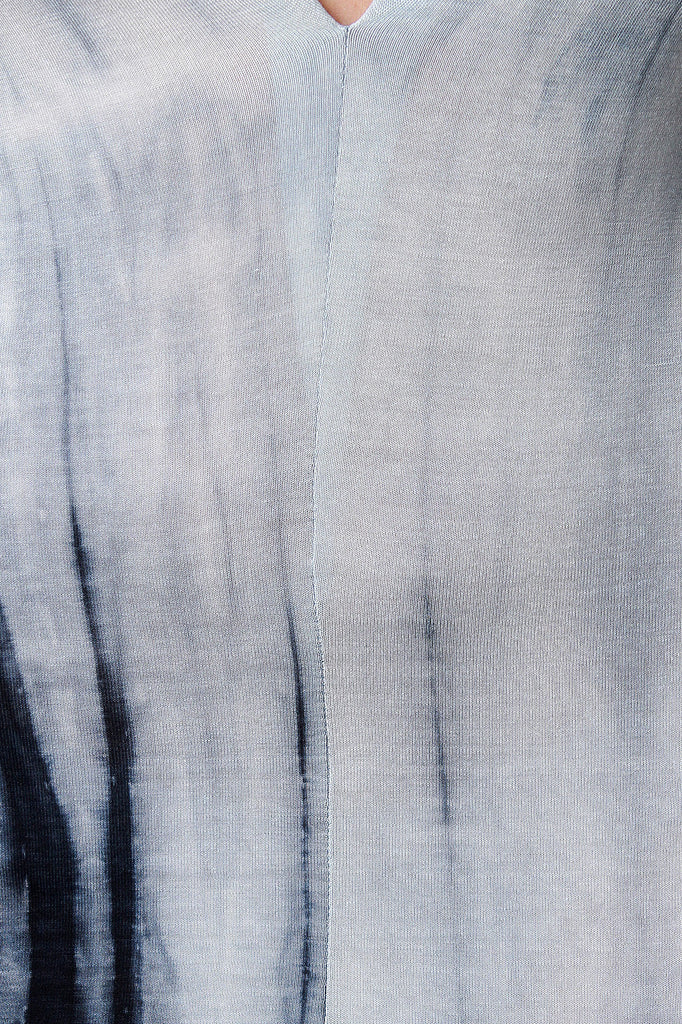 This maxi dress features a jersey knit fabrication, tie dye print design, plunging v-neckline, and crisscross back detail. Finished with a one side high slit. Accessories sold separately. Made in U.S.A. 96% Rayon, 4% Spandex.