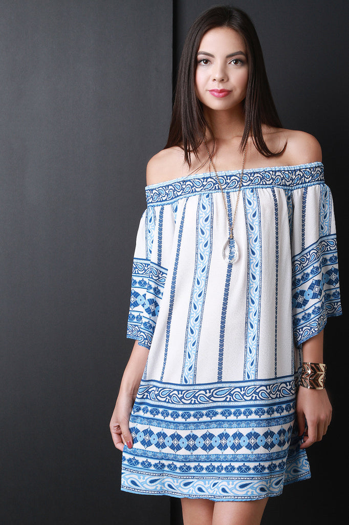 This bohemian pattern dress features an smock off the shoulder neckline, short sleeves, and shift cut fit. Accessories sold separately. 100% Polyester.