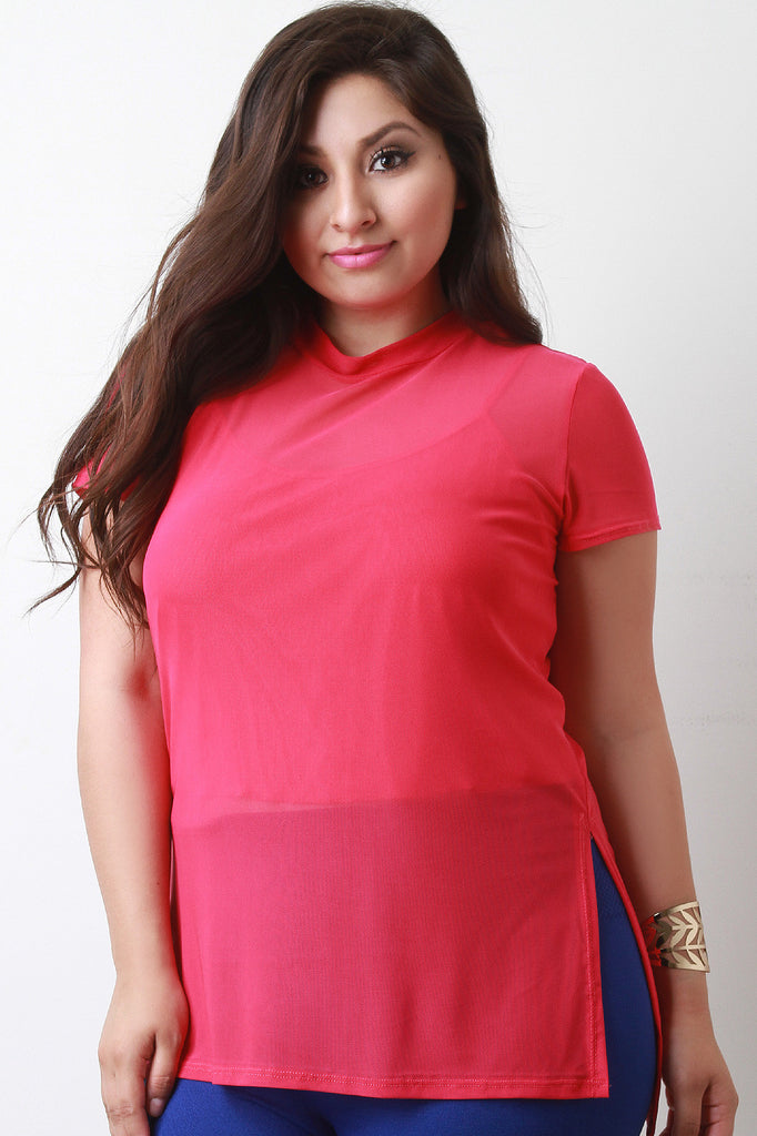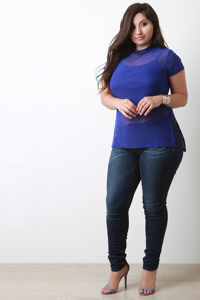 This plus size top features a mesh overlay on a smooth knit tank cropped top underlay, mock neckline, and cap sleeves construction. Finished with a high low hemline, double button hook closure at nape, and side slits. Accessories sold separately. Made in U.S.A. 90% Nylon, 10% Spandex.
