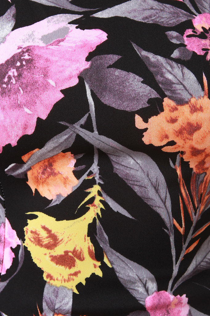 This midi dress features body-hugging stretch knit, floral print, square neck, short sleeves, and back zipper closure. Accessories sold separately. Made in USA. 95% Polyester, 5% Spandex.