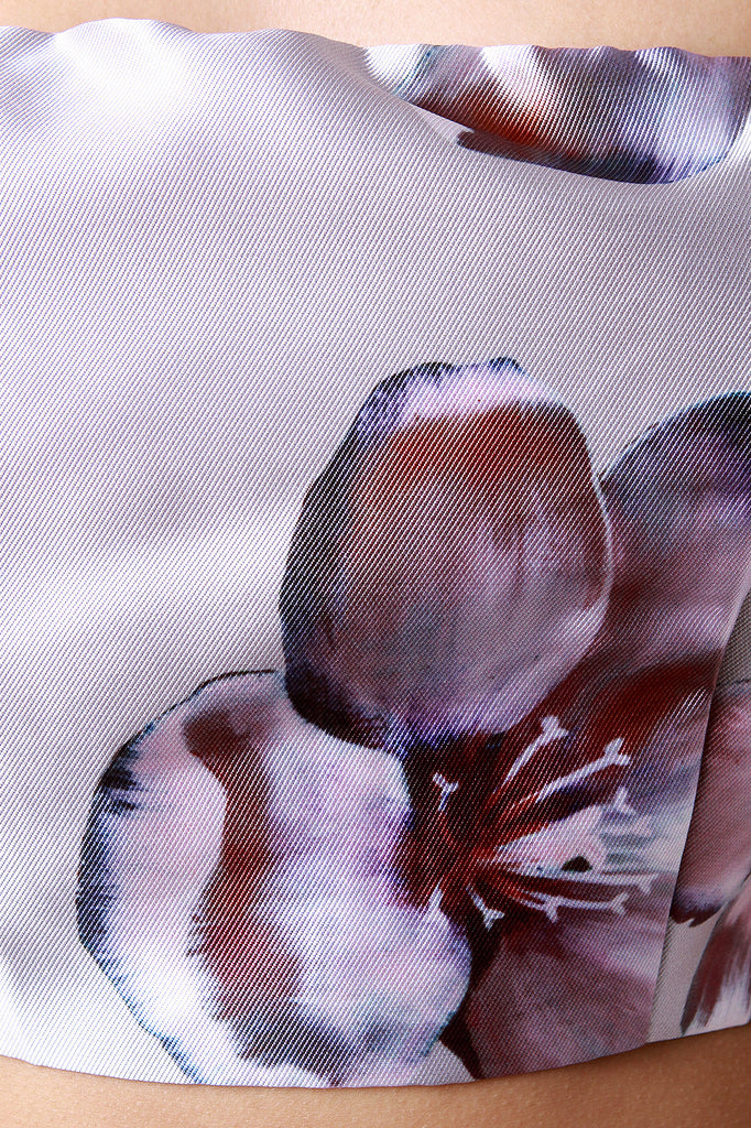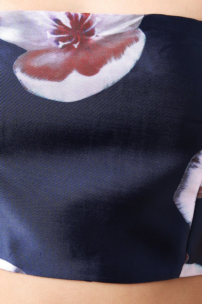 This tube top features a silky knit fabrication, floral print pattern, and elasticized trim. Finished with a rear zipper fastener. Accessories sold separately. 100% Polyester.