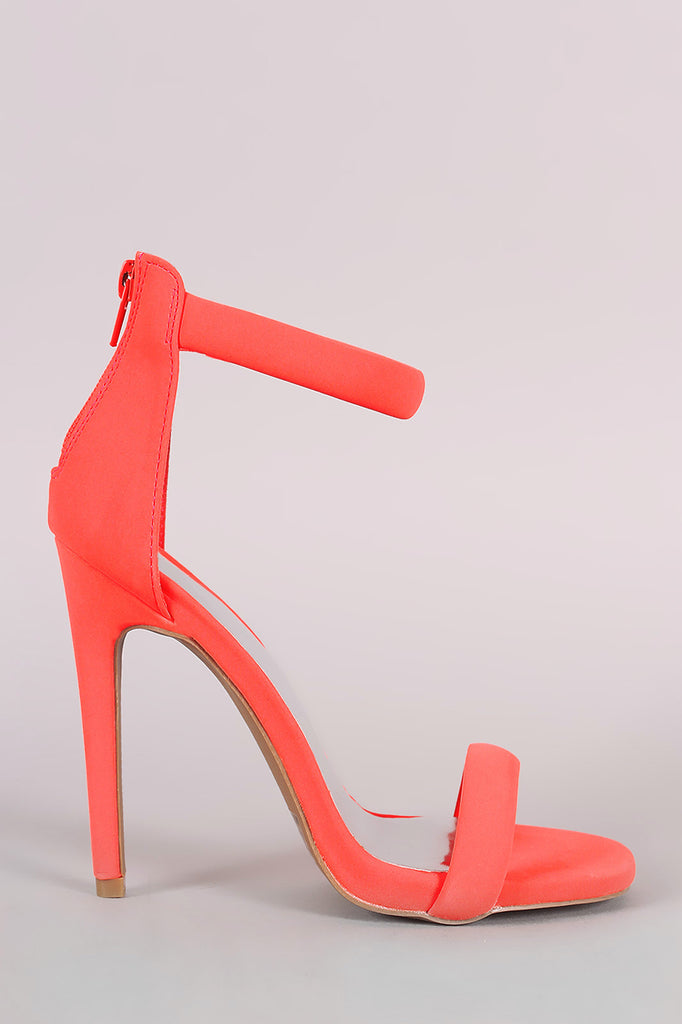 This open toe heel features a single strap across vamp, wrapped stiletto heel, and ankle strap with partial elastic insert. Finished with a lightly padded insole and rear zipper closure.