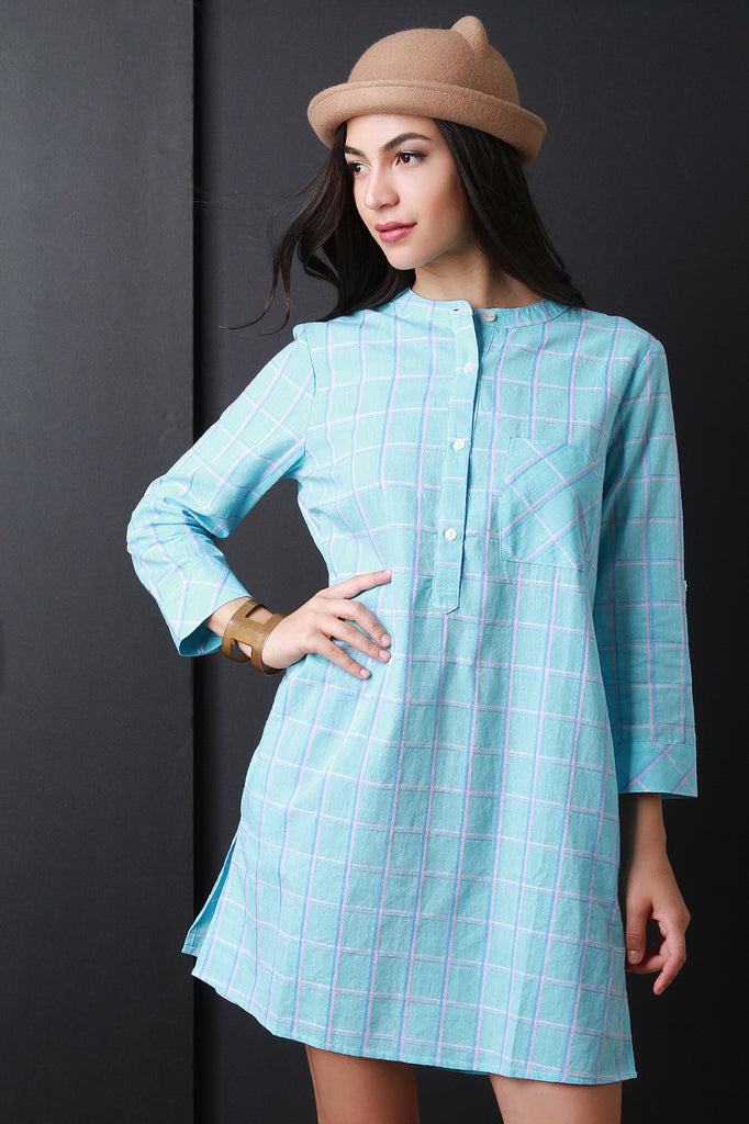 This casual dress features woven plaid fabric, button-up front, single breast pocket, long sleeves, and side slits. Accessories sold separately. 100% Cotton.