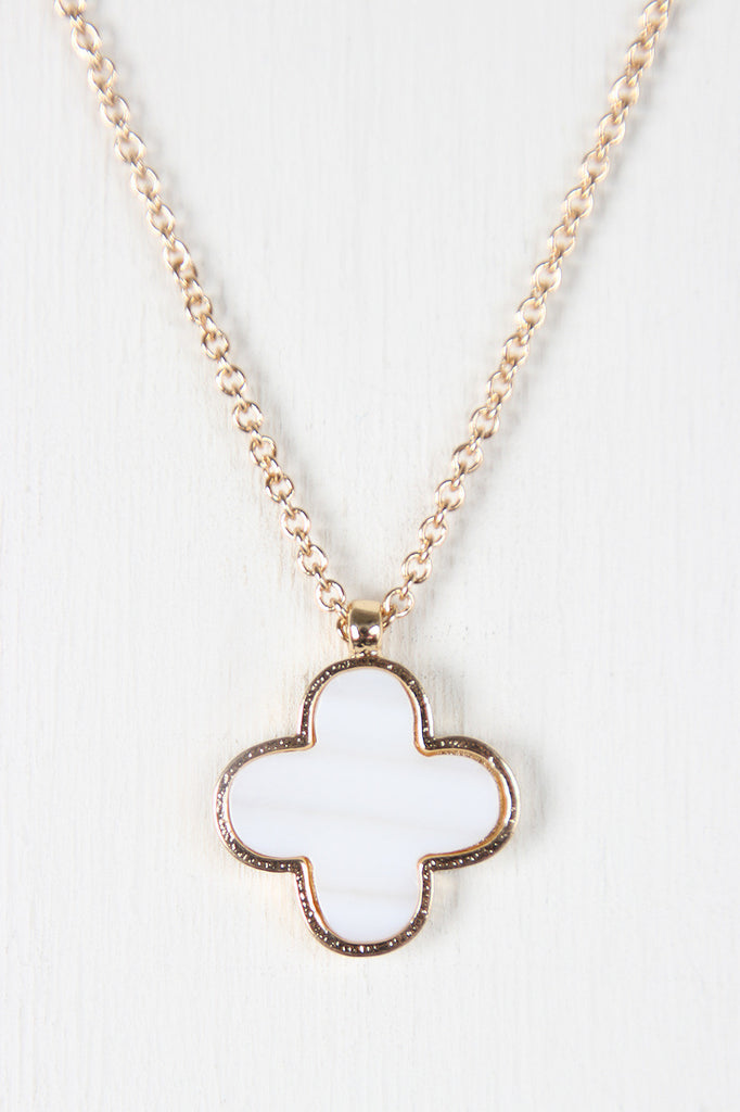 This simple charm necklace features thin cable link chain, a small clover charm with a faux pearl center and an adjustable lobster claw closure.