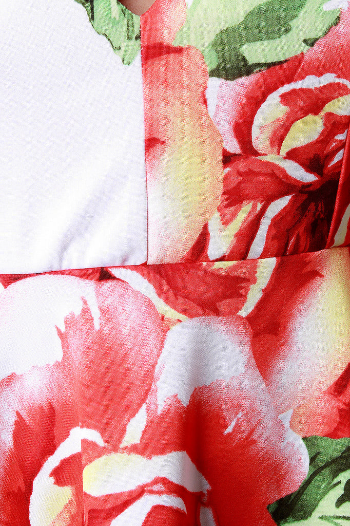 This plus size dress features a floral print pattern, v-neckline with crisscrossing straps detail, sleeveless fit, and flared skirt. Finished with a midi-length hemline. Accessories sold separately. Made in U.S.A. 95% Polyester, 5% Spandex.