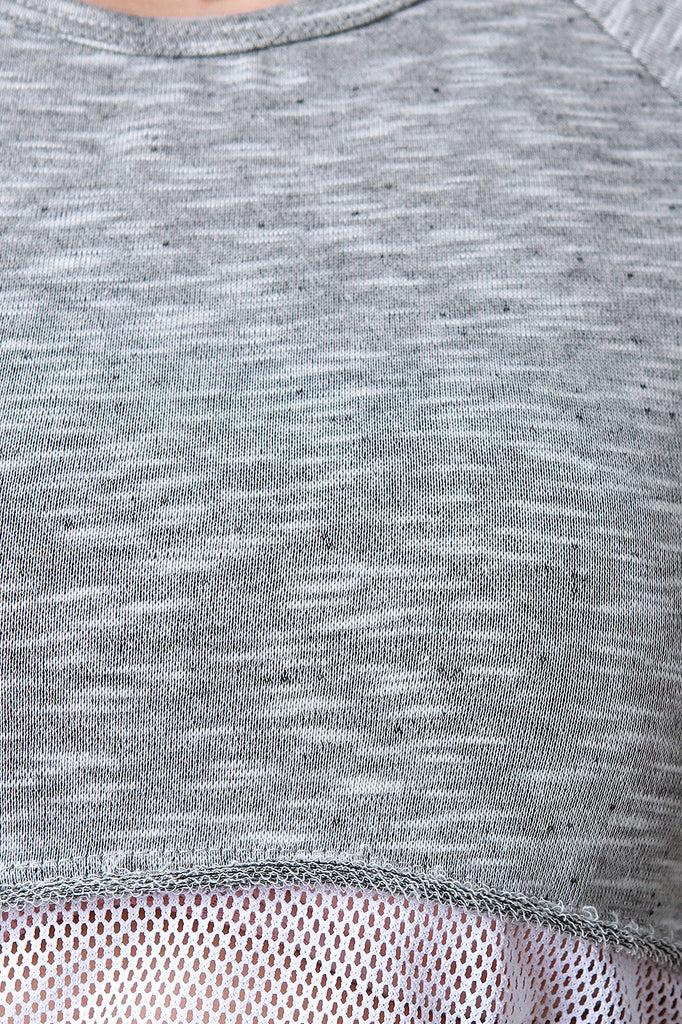 This sporty top features a marled knit fabrication with contrasting fishnet hemline, folded short sleeves, and round neckline. Finished with a cropped hemline. Accessories sold separately. Self: 80% Rayon, 17% Polyester, 3% Spandex. Contrast: 95% Polyester, 5% Spandex.