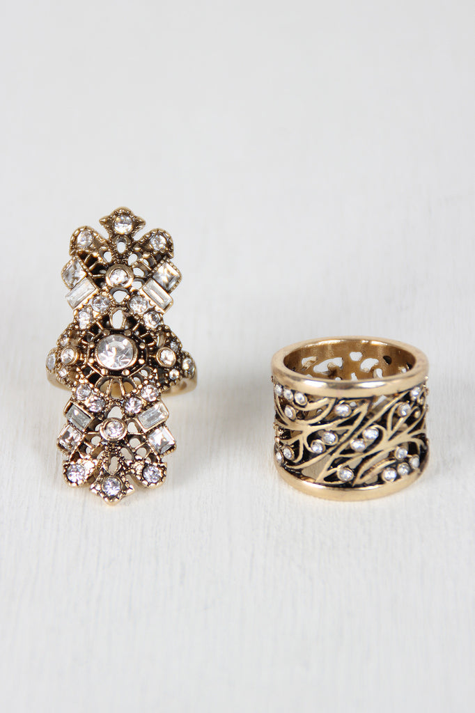 This ring set features two rings, one wide filigree cut out ring with rhinestones and one oval shaped ornate rhinestone encrusted ring.
