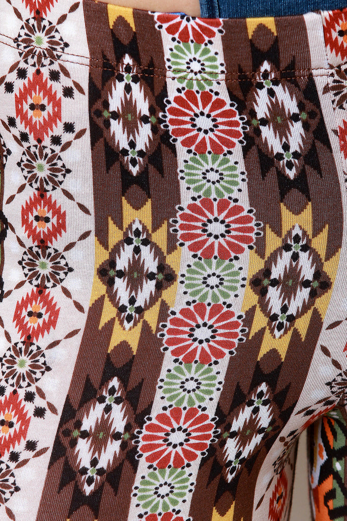 These colorful pants feature a jersey knit fabrication designed with a floral bohemian print, and flared bottoms. Finished with an elasticized waist and high waisted fit. Accessories sold separately. Made in U.S.A. 95% Rayon, 5% Spandex.
