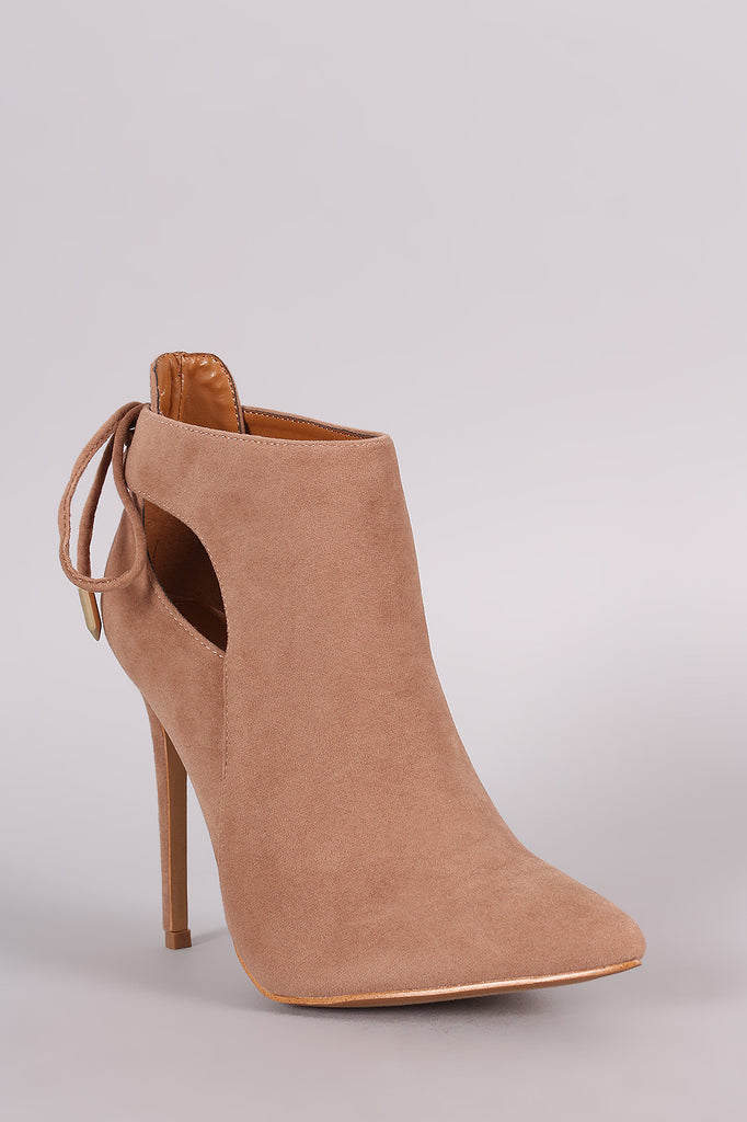 These stunning booties feature a soft vegan suede with side cutout detail and back lace-tie closure. Finished with a stiletto heel and lightly padded insole.