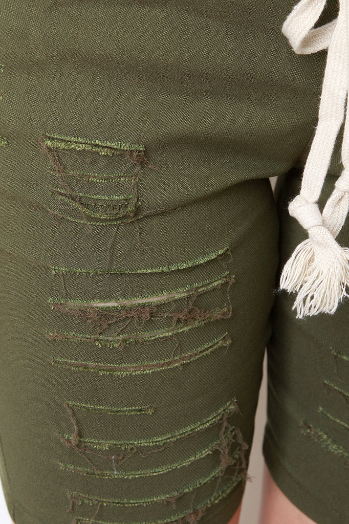 These stylish shorts feature a stretchy knit fabrication, razor-cut details at front and back pockets, 4-pocket design, and elasticized waist band with self-tie lace. Accessories sold separately. 95% Cotton, 5% Spandex.