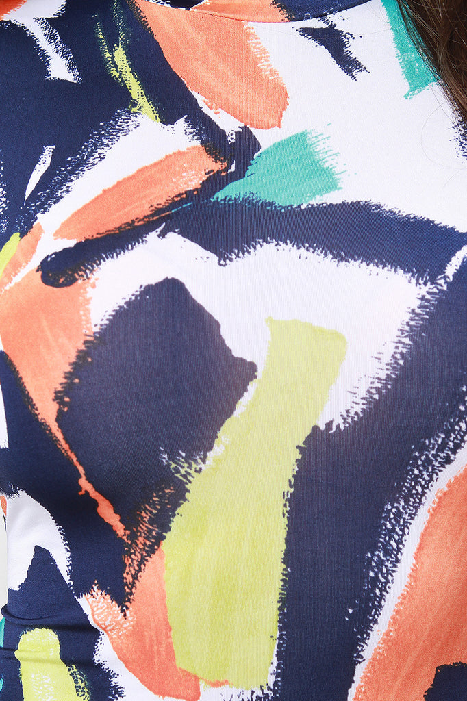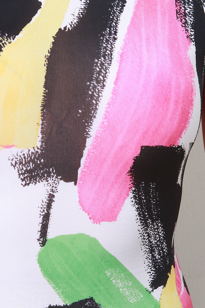 This dress features knit fabrication, abstract painted print a mock neck, cap sleeves, a curve hugging bodycon fit, high side slits and a rounded hem. Accessories sold separately. Made in U.S.A. 95% Polyester, 5% Spandex.
