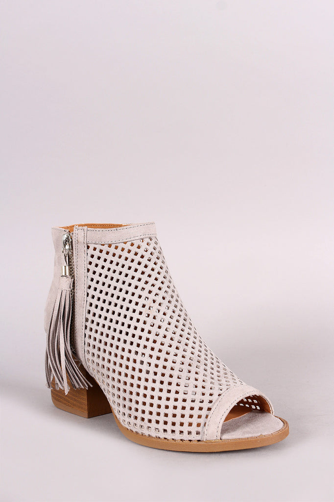 This chic bootie features a vegan suede upper with a mesh like cut out detail. on the front half, peep toe silhouette, stacked block heel, side zipper with a fringe tassel detail, finished with a cushioned insole.