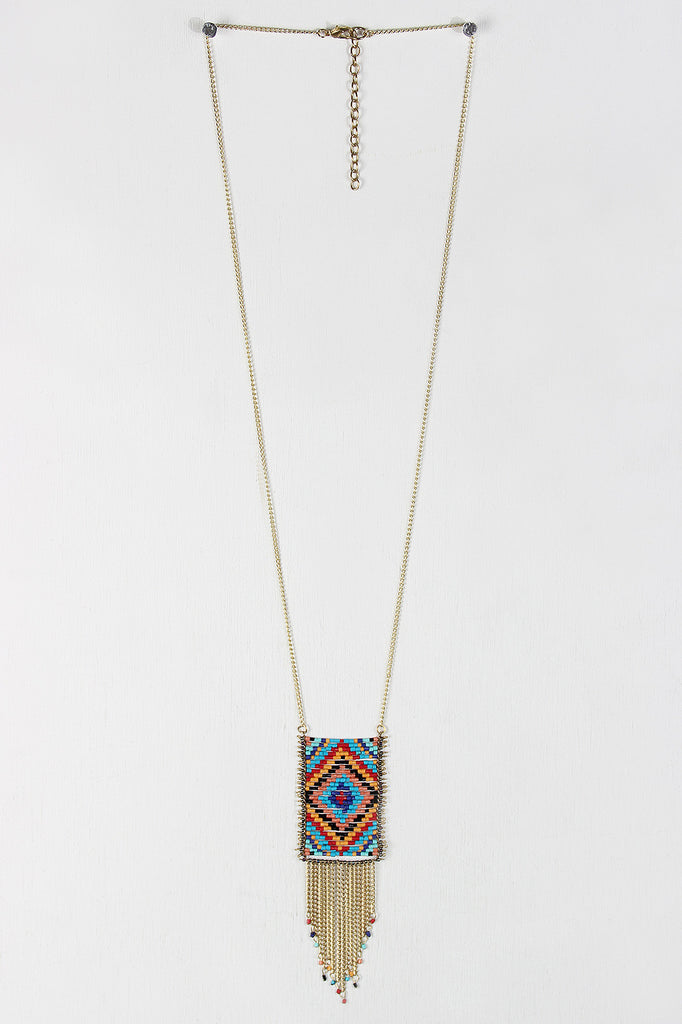 This pendant necklace features a curb link chain, beaded Native inspired colorful square, with chain fringe attached to the bottom. Finished with an adjustable lobster claw closure.