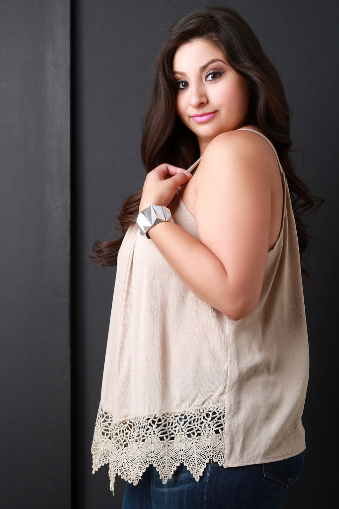 This plus size top features a textured woven fabric, ruffled halter neckline with keyhole detail, and front scallop crochet-trimmed hemline. Finished with a back self-tie drawstring. Accessories sold separately. Made in U.S.A. 100% Rayon.