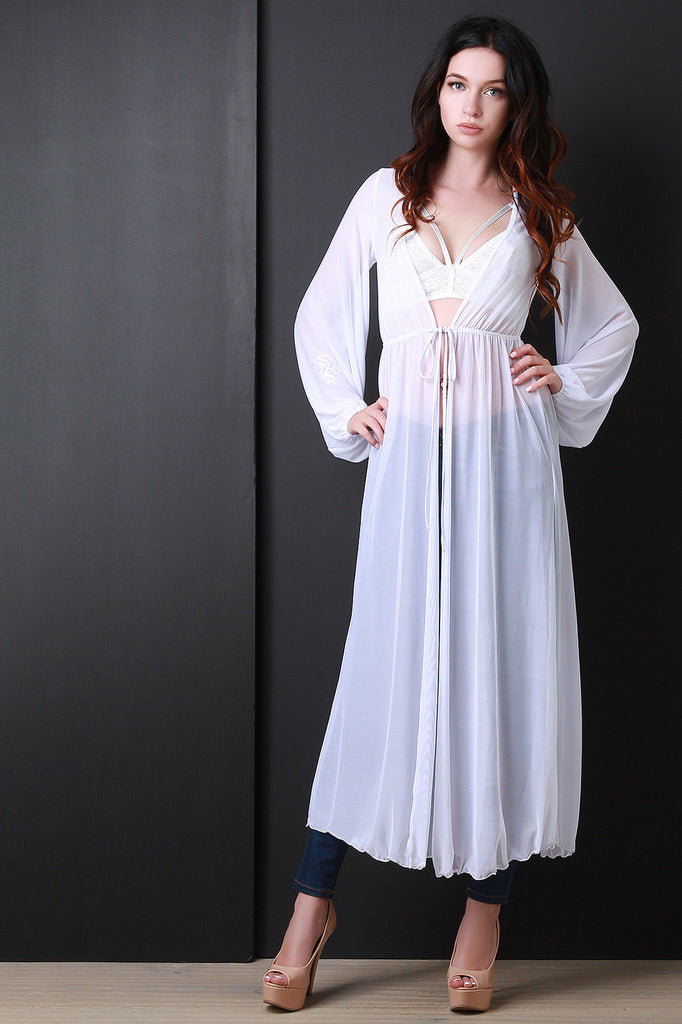 This maxi cover up features semi-sheer mesh, self-tie front, and long bishop sleeves. Accessories sold separately. Made in USA. 100% Polyester.