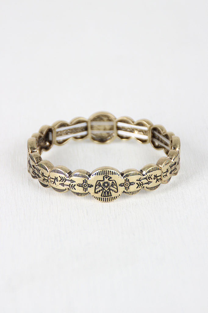 This Navajo inspired bracelet features a, elastic design, brushed metal finish with pictures of birds and arrows etched on it.