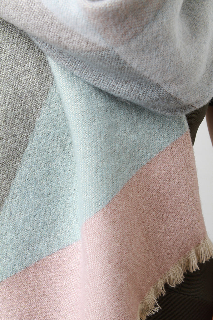 This scarf features an over-sized design, fringe hems,soft touch, woven fabrication, and a color-blocked geometric pattern. 100% Acrylic.