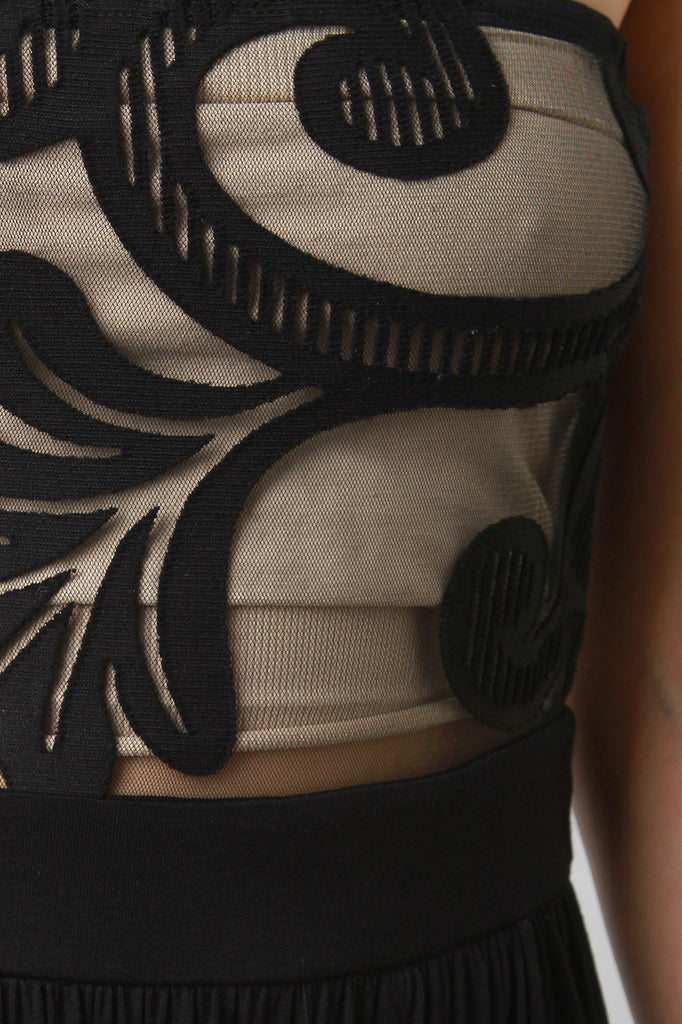 This sleeveless maxi dress features a semi-sheer mesh upper half with vine lace accent, elasticized tube neckline, high waisted pleated waist, brief underlay, and m-slit front. Accessories sold separately. Made in U.S.A. 83% Polyester, 32% Ryon, 5% Spandex.