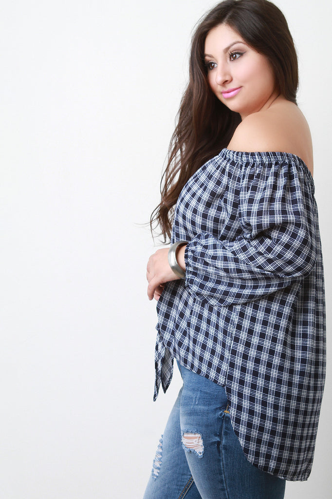 This plus size top features plaid print, elasticized off the shoulder neckline, long bishop sleeves, self-tie front, and high-low hem. Accessories sold separately. Made in USA. 100% Polyester.