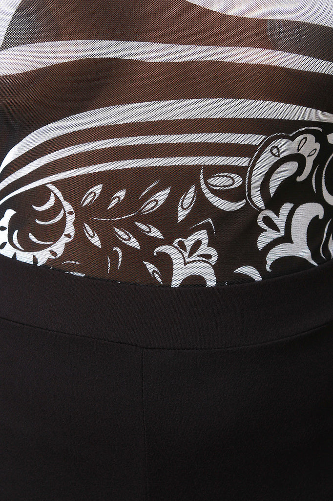This stylish jumpsuit features a contrasting printed mesh top, solid taper cut bottom, round neckline, and longsleeves construction. Finished with a rear zip-up closure. Accessories sold separately. Made in U.S.A. 95% Rayon, 5% Spandex.