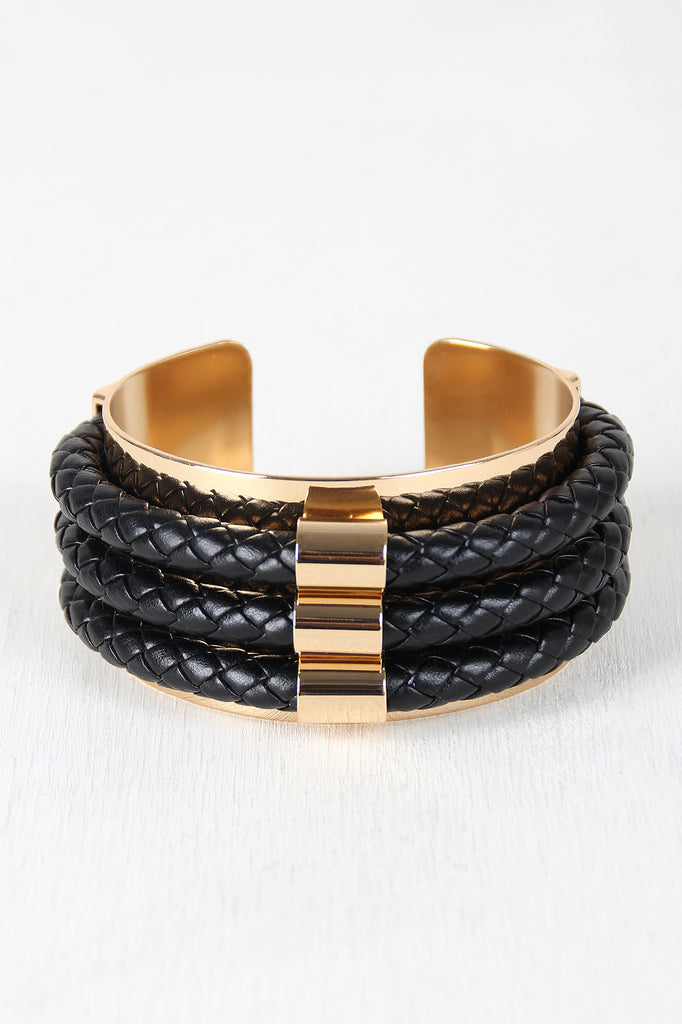 This cuff features a high polished metal finish and 3 braided vegan leather cords. Open ended design for easy on/off.