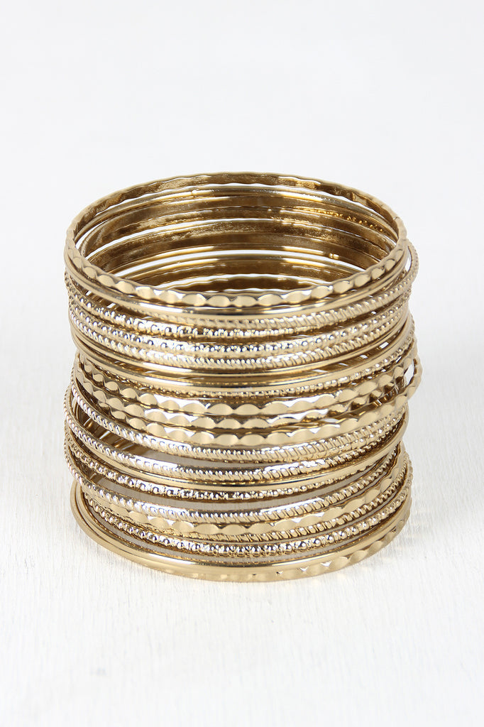 A set of 24 etched, hammered, and smooth polished design bangles .
