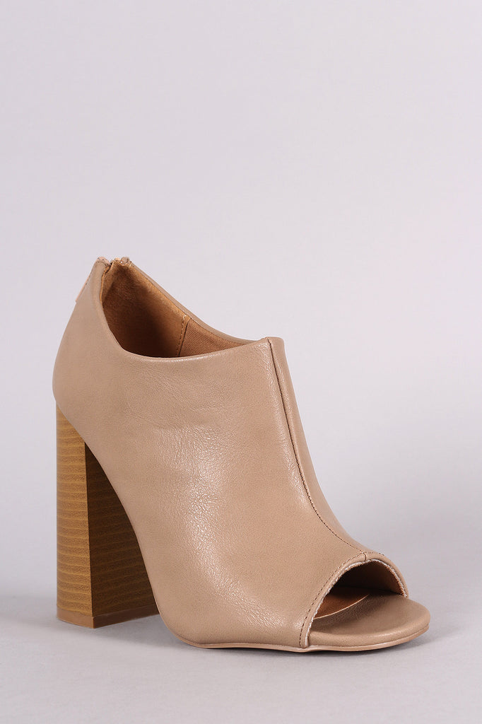 This retro inspired booties feature a stacked heel, open toe, vegan leather upper, low cut ankle opening with a back zipper for easy on/off.