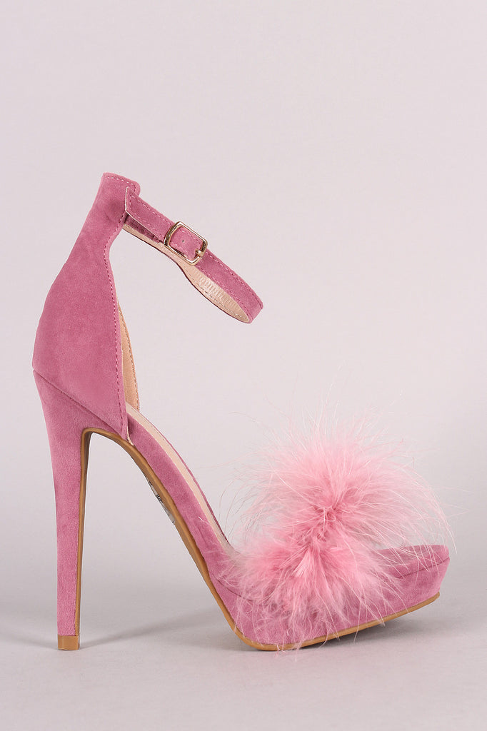 This trendy platform heel features a single band across vamp with fluffy feather trim, open toe silhouette, and wrapped heel. Finished with lightly padded insole and adjustable ankle strap with buckle closure.