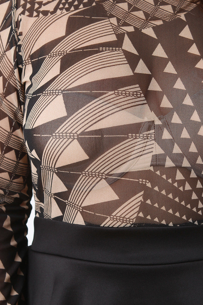 This plus size twofer dress features a semi-sheer mesh upper half, geo pattern print, mock neckline with double button closure at nape, long, sleeves, and contrasting peplum skirt half. Accessories sold separately. Made in U.S.A. 96% Polyester, 4% Spandex.