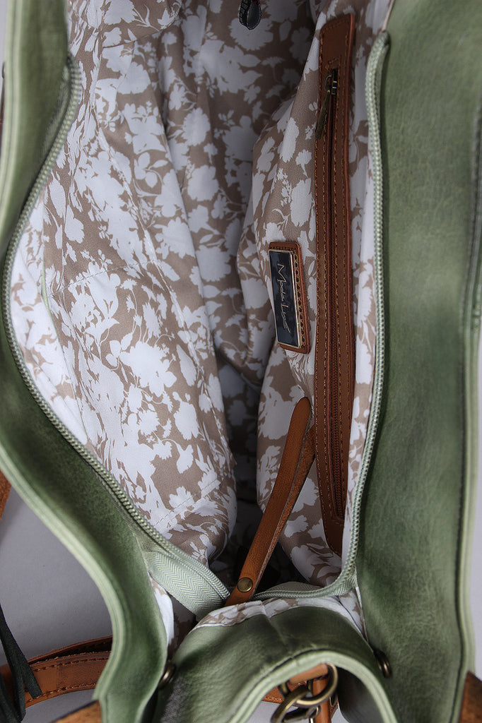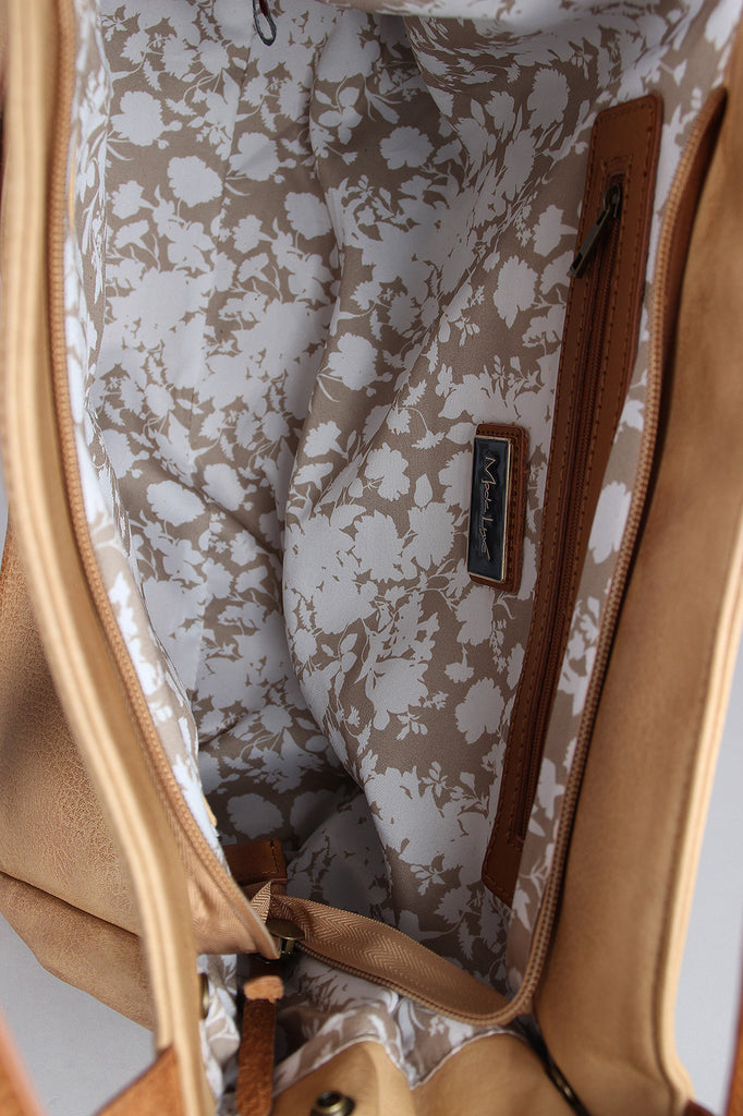 This bag features a distressed vegan leather fabrication, tassel charm, 2 zipper pockets on the outside, double handles and a removable cross body strap, fully lined with a cute floral print lining, with a zipper pocket and 2 pouch pocket in lining. Finished with a top zipper closure and snaps to adjust the top opening.