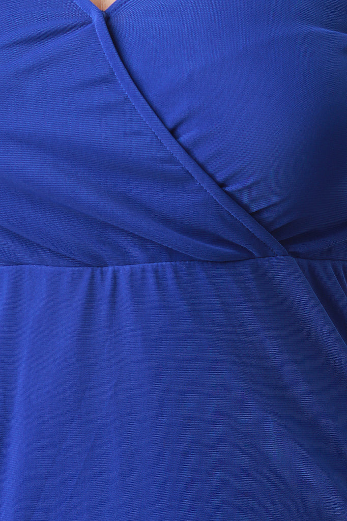 This sophisticated plus size dress features a semi-sheer mesh fabric, surplice neckline with snap button closure, and front slit with draping detail and cinched sides. Finished with a longsleeves fit, maxi-length hemline, and partially lined. Accessories sold separately. 70% Nylon, 20% Polyester, 10% Spandex.