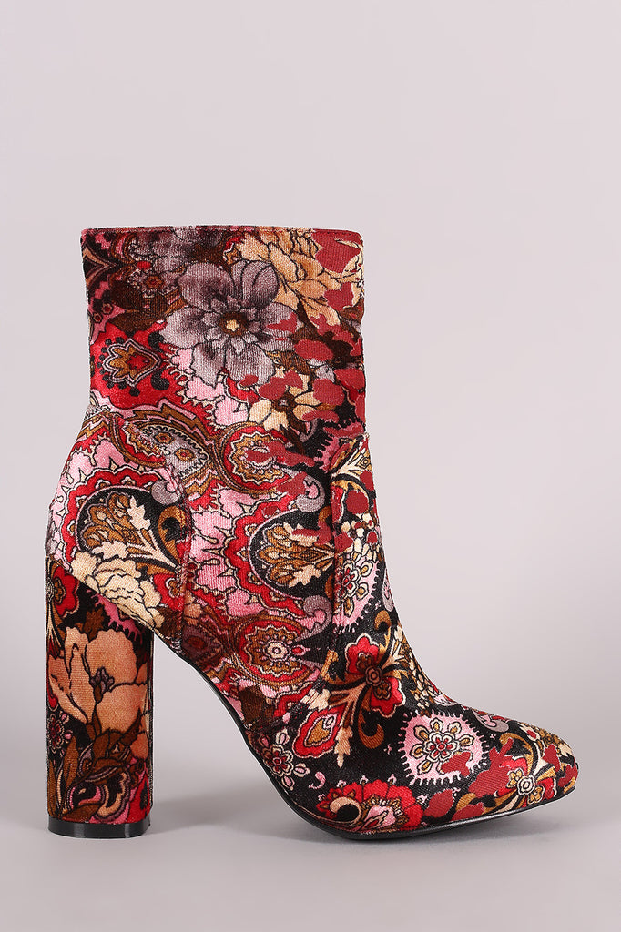 These booties feature a velvet fabrication with a multi colored floral print, wrapped round chunky heel, pieced design with top stitching, single sole, lightly padded insole for comfort, and a side zipper for easy on/off.